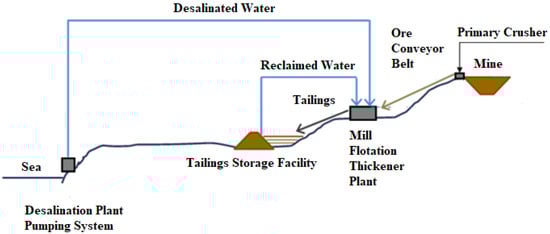 In the case of sea water, the different possible locations for the water intake plant at the coast, the requirement or not for desalination, the required pumping station, and the transport pipelines must be analyzed [6]. In the design phase of the desalination and pumping plant, it is important to consider the variability of the required water flow from the ocean. In general, water losses in tailings deposits increase over time due to: (i) increased evaporation area of the pond of clear water, and (ii) increased consolidation of the deposited tailings, which implies higher seepages also involving seasonal variations.