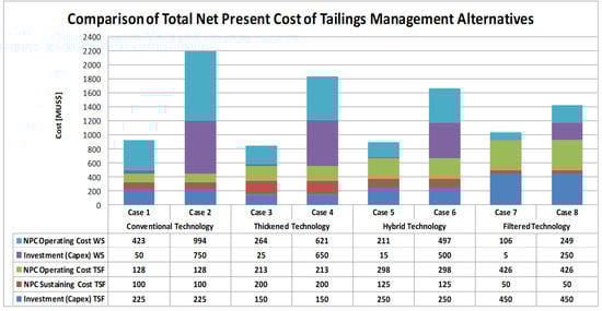 The results indicate that fresh water supply use, given the specific characteristics of this large-scale mining production study case, thickened tailings technology is the most cost-effective alternative. The second options, not too far from the first place, are conventional tailings technology and hybrid tailings technology. Competitiveness of these alternatives against thickened tailings technology will depend heavily on the unit cost of fresh water and the efficient management performance to control water loss.