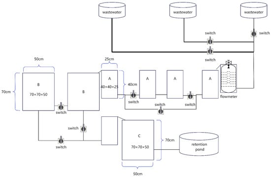 The device was divided into three units. The first unit (A) contained four rectangular plastic cylinders (40 cm × 40 cm × 25 cm). Activated carbon, volcanic stone, and Al@TCAP-N (ratio = 1:1:1) were wrapped in a net bag and placed at the bottom of the device. The second (B) and third (C) units were two cylinders (70 cm × 70 cm × 50 cm) and one (70 cm × 70 cm × 50 cm) square plastic cylinder, respectively, which were mainly used for strengthening treatment. The device combined the three modules through plastic pipes and adjusted the relevant parameters by controlling switches for the different designed experiments (Figure 1). Water samples were collected at 0.5 m below the water level with a 500 mL plastic bottle and were stored in the refrigerator for 3 repetitions.