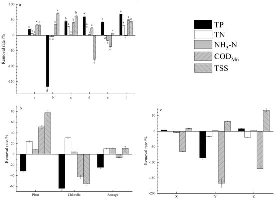 Removal rate for each water quality index in different treatments. (a) Six purification materials, (b) the single treatment of three purification materials, and (c) the three combined materials.