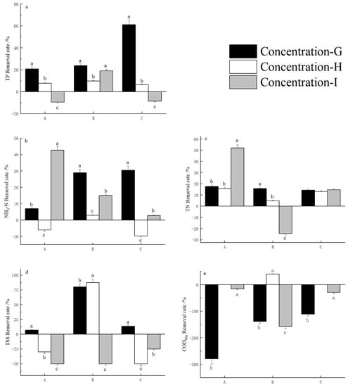With a high concentration load, the removal rate of TP, TN, and NH3-N in the wastewater reached 60%, 20%, and 30%, respectively. Suspended matter could also be removed well, but the CODMn treatment effect was unsatisfactory (Figure 3). With medium concentration, the effects of all water quality indexes decreased, with TP, TN, NH3-N at about 10%, 20%, and 10%, respectively. Suspended solids also had some removal effect, but the removal rate of CODMn reached 30%. With low concentration, the removal rates of TP, TN, and NH3-N reached 20%, 15–50%, and 15–40%, respectively, but the removal rates of CODMn and suspended matter decreased.