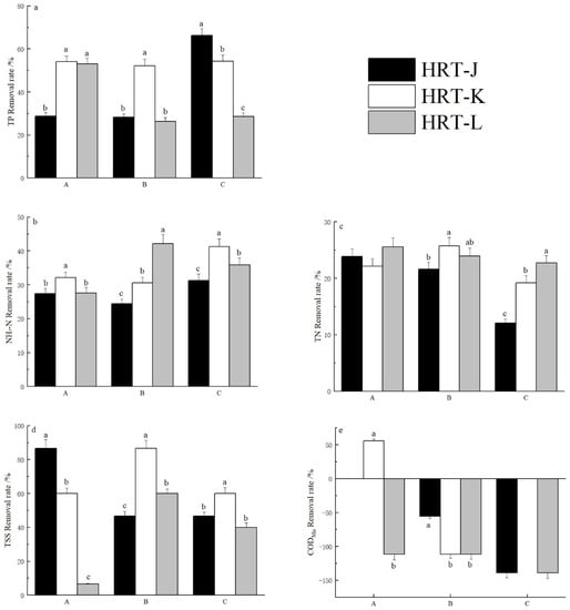 After hydraulic retention for 1 h, the removal rates of TP, TN, NH3-N, and TSS in wastewater by this system reached 30%, 20%, 25%, and 40–80%, respectively (Figure 4). The removal rate of TP, TN, NH3-N, and TSS in wastewater by this system reached 50%, 20%, 30%, and 60–80% in 2 h hydraulic retention time. When hydraulic retention time reached 3 h, the removal rates of TP, TN, NH3-N, and TSS in wastewater reached 20–50%, 25%, 25–40%, and 40–60%. In summary, it could be found that the removal rate of CODMn at each stage had a certain effect, and with the increase in hydraulic retention time, the removal rates of various water quality indicators in wastewater of this system showed an increasing trend, enhancing the treatment effects of purification materials on wastewater to a certain extent. However, too long of a hydraulic retention time (3 h) had a poor effect on the removal ration of CODMn.