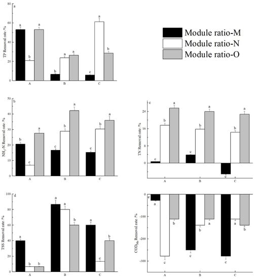 Wastewater treatment effects under different unit ratios were analyzed. When the ratio of each unit at all levels was 1:1:1, removal rates of TP, TN, NH3-N, and TSS reached 20–50%, 20%, 25–40%, and 40–60%, respectively (Figure 5). When the ratio was 2:1:1, removal rates of TP, TN, NH3-N, and TSS reached 20–60%, 20%, 30–70%, and 10–80%. When the ratio was 2:2:1, the removal rates of TP, TN, NH3-N, and TSS reached 30–50%, 25%, 30–40%, and 10–60%, respectively. The CODMn of each unit changed with each ratio, and when the ratio was 2:1:1, comprehensive removal rates of various indicators of wastewater of each unit were better.