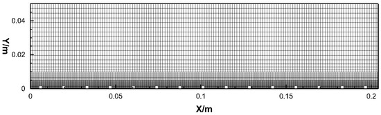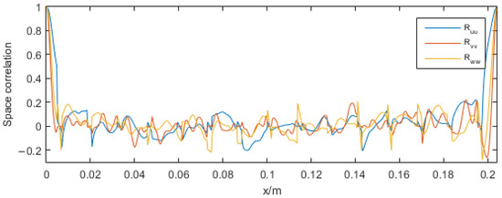 For a uniform flow, the usage of periodic boundary conditions on upstream and downstream boundaries is valid for time-averaged velocities but not for velocity fluctuations. To evaluate the influence of the periodic boundary condition, spatial correlation coefficients between the inlet and the downstream points on the centerline at y = 1 mm were calculated and are shown in Figure 4. It was observed that the use of the periodic boundary condition only affected a small range near the boundaries, indicating that in the near-wall region, the longitudinal correlation of the velocity fluctuation was weak, and that the periodic boundary condition had a minor effect on the near-wall flow field. This enables the application of the periodic boundary condition for the purpose of reducing the total grid amount and improving the efficiency of the simulation.