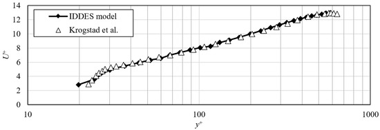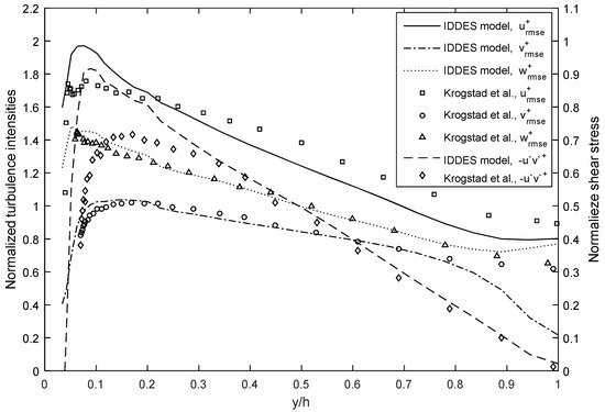 in open-channel turbulence, in which H represents the flow depth (and equals to h here), as in the outer region, can be calculated from the intercept of the linear part of at y = 0. The non-dimensional quantities are marked by the ‘+’ superscript in this paper. The velocity’s relative error of the IDDES model was calculated on each point on the profile, and their average was 5.0%. The normalized turbulence intensities and Reynolds shear stress of the IDDES model and Krogstad, et al.’s measurement are shown in Figure 3, where the turbulence intensities are represented by the root mean square error of the flow velocities and are marked by the ‘rmse’ subscript. The average relative errors of the turbulence intensity profiles in the x, y, and z directions were 9.5%, 9.0%, and 4.3%, respectively. As for the Reynolds stress profile, the absolute error was calculated, because the normalized Reynolds stress value approached zero on the top boundary. The absolute average error of the normalized Reynolds stress was 0.151, which was especially higher in the near-wall region where the numerical results exceeded the measurements. This was also observed in Krogstad, et al.’s direct numerical simulation (DNS) results, as the intrusive hot-wire method applied in the research caused errors in the vertical velocity measurements in the near-wall region, which tended to underestimate the measured Reynolds stress peak compared with the DNS. In other words, the real peak of the normalized shear stress should have been higher than the measured results in Krogstad, et al. [29]. For y/h > 0.2, the average error of the numerical model was reduced to 0.028, indicating that the agreement of the IDDES model was satisfactory.