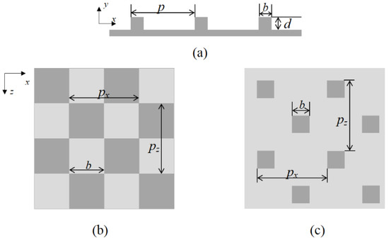 Arrangement of roughness elements on the channel bed: (a) 2D square bars, (b) 3D cube chessboard arrangements, and (c) 3D cube stagger arrangements. Dark squares in (b,c) indicate the locations of roughness elements. Flow direction is along the x direction.