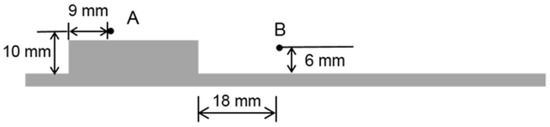 Previous studies suggested a spatial variation in the time-averaged shear stress on the horizontal plane near the rough floor, and that its distribution depends on the pattern of the roughness element arrangements [16]. It is necessary to classify the locations around the roughness elements and to conduct an analysis by different locations. Considering the periodic arranging patterns of the roughness elements in the present study, the locations over the roughness elements and the locations behind the roughness elements were selected since they were, respectively, under the control of the main flow and the recirculation flow in the cavities. In the quadrant analysis of the instantaneous shear stress, we chose locations above each roughness element at y = 10 mm and 9 mm behind the front edge of the roughness element (type A) and locations 18 mm behind the back edge of each roughness element in the cavities at y = 6 mm (type B). This selection is shown in Figure 6 and would be applied in all cases for further comparison. The instantaneous shear stress in the sampled 6000 steps was analyzed.