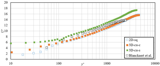 Volino et al. suggested that the complete obstruction over the channel width in two-dimensional cases forces flow detachment and acceleration over the bars and leads to a larger ks/d and vertical range affected by the rough wall [23,37]. The complete blockage in the lateral direction forces the flow to go over the roughness bars, offsetting the position of the maximum time-averaged shear stress away from the wall [23]. This phenomenon was also observed in this study, as 2D-sq had the largest , ks/d, and urmse+. Comparatively, a horizontal flow around the roughness elements was allowed for the typical three-dimensional 3D-cu-s case, where uniform distributions of the horizontal velocity (both time-averaged values and their fluctuations) were found in the element roughness layer. With regard to 3D-cu-c, the top surface drag of the roughness element forced its upstream flow to its two side cavities by going over the corner connections, although the chessboard-arranged roughness elements let no interstices between them. As a result, the flow in the roughness element layer was similar to 2D-sq, while the flow over the roughness element was similar to 3D-cu-s.