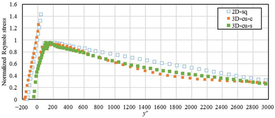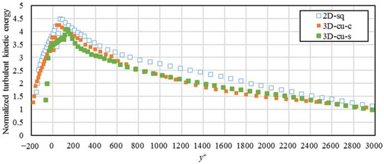 Figure 8 displays the normalized Reynolds shear stress profiles and Figure 9 shows the normalized turbulent kinetic energy profiles, both of which were averaged horizontally over the computational domain. A sharp increase in the Reynolds shear stress in 2D-sq and 3D-cu-c was observed in the near-wall region, as the vertical recirculation flow in the cavities between the roughness elements produced a strong shear. A jump in the Reynolds stress profile was found at the top face of the roughness elements, above which the form drag due to the roughness element vanishment. Above the roughness element layer, the three-dimensional cases were roughly 20~30% lower than the two-dimensional case in the y+ = 800~2600 range, which was noted by Volino et al., indicating the influence of the different roughness dimensions. There was a local peak for the Reynolds shear stress above the roughness elements, respectively, at y+ = 237, y+ = 86, and y+ = 142 in 2D-sq, 3D-cu-c, and 3D-cu-s. The increasing and decreasing trends in the turbulent kinetic energy between the three cases were relatively similar, while their turbulent kinetic energy was basically dependent on the value of . However, the peak in 2D-sq was greater than in the two three-dimensional cases, indicating the difference in the flow structures among the three cases.