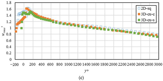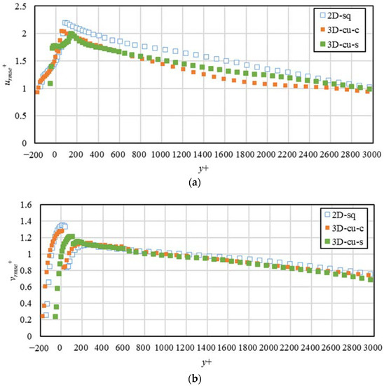 The influence of the rough wall to the time-averaged shear stress could be partially reflected by its components u′ and v′, while urmse, vrmse, and wrmse are evaluations of the magnitude of the velocity fluctuations. Figure 10 displays the urmse, vrmse, and wrmse profiles, normalized by . For the open-channel rough turbulence, urmse+ > wrmse+ > vrmse+ was observed [22,36]. The roughness elements exerted a greater impact on the velocity fluctuation in the near-wall region. Below y+ = 100 in the roughness element layer, 2D-sq and 3D-cu-c had a similar urmse+ and vrmse+, while 2D-sq and 3D-cu-s had a similar wrmse+. This similarity is related to the overlapping of the normalized Reynolds stress in this region for 2D-sq and 3D-cu-c. In the outer region, the urmse+ differences between the cases were similar to that in the Reynolds stress profiles, with the three-dimensional cases around 12~22% lower while the vrmse+ values were almost identical. This indicates that the differences in the Reynold stress might have mainly resulted from the differences in the longitudinal velocity fluctuation characteristics.