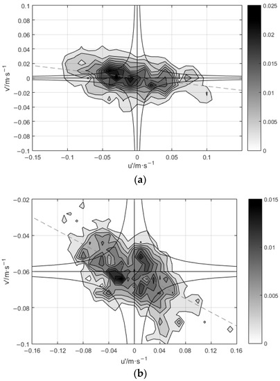 Quadrant analysis was first conducted by Wallace et al. to explore the unknown information on Reynolds shear stresses from velocity fluctuations [32]. The principle of this method is to classify shear stress u′v′ into four categories by instantaneous turbulent velocity fluctuations (u′, v′): Q1 (+u′, +v′), Q2 (−u′, +v′), Q3 (−u′, −v′), and Q4 (+u′, −v′), each of which represents an event of the turbulent burst phenomenon. In this way, shear stress characteristics including magnitude, contributions of each event, and velocity fluctuation components can be investigated by quadrants [9,33].