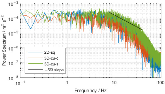 Figure 12 displays the power spectrum of the shear stress temporal signal. The major part of the shear stress energy is contained in low-frequency fluctuations, and a −5/3-law can be observed in the power spectrum, which is similar to turbulent kinetic energy and scalar transportation [34,40,41,42]. The frequency range of the −5/3-law is roughly from 8 Hz to 30 Hz. Taking the local time-averaged velocity as the characteristic velocity, the corresponding length scale range is about from 1 mm to 7 mm. The largest length scale has the same order of magnitude as the roughness element size and the smallest length scale has the same order of magnitude as the Kolmogorov length scale.