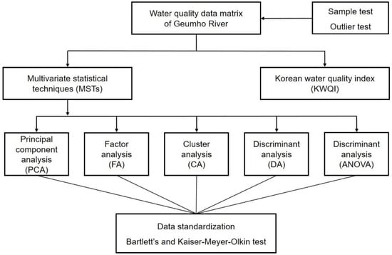 In this study, the water quality characteristics of the Geumho River were assessed using various MSTs, along with the Korean WQI (KWQI). The combination of these techniques could effectively evaluate the water quality characteristics relative to their individual use. The key purpose of this study was to (1) identify major factors affecting the river water quality using PCA/FA, (2) perform spatial and temporal classification using CA, (3) identify the characteristics of river water quality by extracting major spatial and temporal parameters using DA, and (4) evaluate the condition of river water quality using KWQI. The data analysis process used for this study is illustrated in Figure 1. The study provides a useful tool for identifying the sources and dynamics of pollutants found in rivers passing through various metropolitan areas, aiding the development of appropriate and targeted water quality control measures.