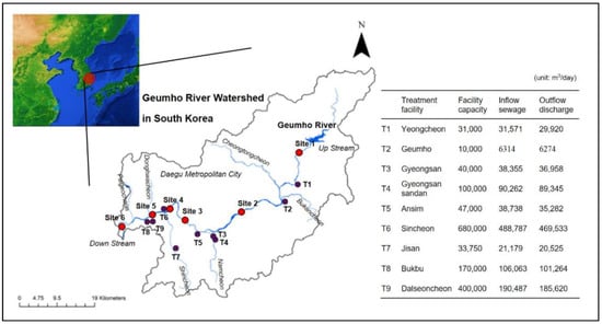 The Geumho River originates in Pohang City and passes through Daegu Metropolitan City via Yeongcheon Dam, Yeongcheon City, and Gyeongsan City (Figure 2).