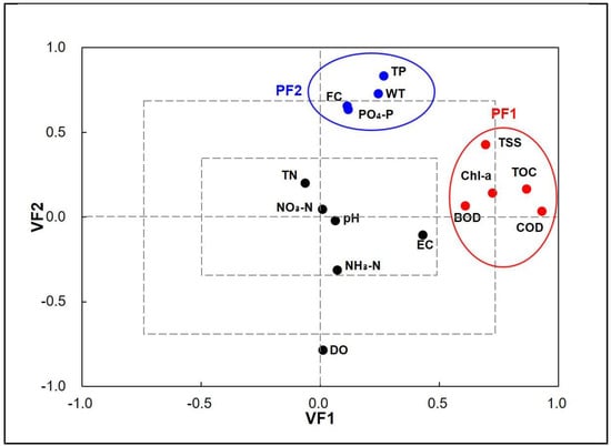 Major factors through the scatter plot of VF1 and VF2. Red indicates the principal factor1 and blue indicates the principal factor2. VF, varifactor; PF, principal factor; WT, water temperature; DO, dissolved oxygen; BOD, biochemical oxygen demand; COD, chemical oxygen demand; TOC, total organic carbon; TSS, total suspended solids; EC, electrical conductivity; TN, total nitrogen; NH3-N, ammonia-nitrogen; NO3-N, nitrate-nitrogen; PO4-P, phosphate-phosphorus; TP, total phosphorus; Chl-a, chlorophyll-a; FC, fecal coliform.