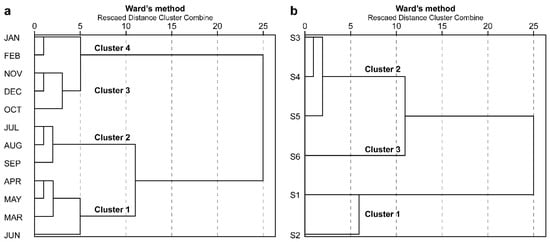 Dendrograms that show seasonal and spatial clusters. (a): seasonal cluster analysis; (b): spatial cluster analysis.