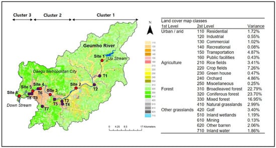 Based on the spatial CA results (Figure 4b), sites S1 to S2 were classified as “cluster 1 (upstream: US)”, sites S3 to S5 as “cluster 2 (midstream: MS)”, and site S6 as “cluster 3 (downstream: DS).” These clusters correspond to the US section with relatively few pollution sources; the MS section with urban STFs; and the DS section with large industrial complexes, WTFs, and greenhouse facilities. These areas are more clearly distinguished from the land-use map of the Geumho River watershed (Figure 5). Cluster 1 corresponds to the area with a high proportion of forests and farmlands; cluster 2 corresponds to urban areas with residential, commercial, and industrial land-cover types; and cluster 3 includes a complex mix of land uses (Figure 5).
