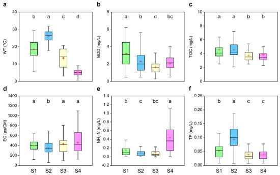 Box plots of the temporal stepwise mode discriminant function. The middle line of each box represents the median value, the lower line represents the first quartile (25%), the upper line represents the third quartile (75%), the lower bar represents the minimum (median-1.5 × interquartile range; IQR), and the upper bar represents the maximum (median + 1.5 × IQR); the red cross mark indicates the average value. IQR is the third quartile minus the first quartile, and the letters above the box plot represent the results of the Scheffe Test (p < 0.05). (a): water temperature; (b): biochemical oxygen demand; (c): total organic carbon; (d): electrical conductivity; (e): ammonia-nitrogen; (f): total phosphorus. S1, spring; S2, summer; S3, autumn; S4, winter.