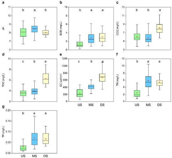 Box plots of the spatial stepwise mode discriminant function. The middle line of each box represents the median value, the lower line represents the first quartile (25%), the upper line represents the third quartile (75%), the lower bar represents the minimum (median-1.5 × interquartile range; IQR), and the upper bar represents the maximum (median + 1.5 × IQR); the red cross mark indicates the average value. The IQR is the third quartile minus the first quartile, and the letters above the box plot represent the results of the Scheffe Test (p < 0.05). (a): pH; (b): biochemical oxygen demand; (c): chemical oxygen demand; (d): total organic carbon; (e): electrical conductivity; (f): total nitrogen; (g): total phosphorus. US, upstream; MS, midstream; DS, downstream.