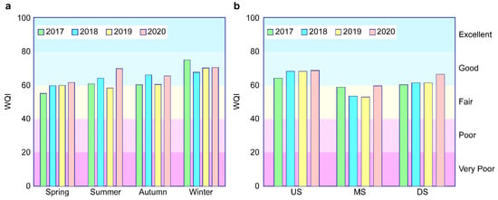 Seasonal and spatial WQI scores. Four bar graphs in each seasonal or spatial group show WQI scores from 2017 to 2020 from the left to right. The letters on the right represent the water quality grades of the WQI. Excellent, Suitable for hydrophilic activities with clean water; Good, Suitable for hydrophilic activities with good water; Fair, sometimes pollutants may be introduced and affect hydrophilic activity; Poor, Attention of hydrophilic activities due to frequent inflow of pollutants; Very poor, Inadequate for hydrophilic activities with a high water pollution level. WQI, water quality index; (a), seasonal WQI; (b), spatial WQI.