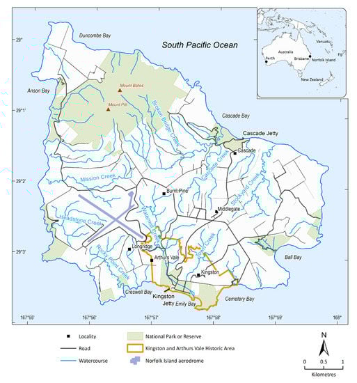 Norfolk island is situated in the south-west Pacific Ocean, occurring as small isolated island representing the only portion of the Norfolk Ridge protruding above sea level [8]. The island is 35.7 km in area (Figure 1). The Norfolk Ridge is a north–south trending submerged (except the very small island portions) continental ridge linking New Zealand and New Caledonia in the south-west Pacific Ocean. Norfolk island is a remnant of a weathered and eroded volcanic complex that began forming as a result of volcanic activity approximately two to three million years ago [9].