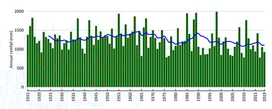 Annual rainfall on Norfolk Island. Blue line indicates 10 year moving mean annual rainfall.
