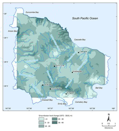 As part of this study, a hydrological monitoring programme was initiated to better characterise and conceptualise the groundwater systems as well as quantify their groundwater balance. Local residents, business owners and island Administration provided permission to access and monitor groundwater levels at 65 locations from 42 bores and 23 wells. Periodic manual static groundwater level observations were recorded at all 65 sites where a standing water level could be obtained with a portable hand-operated electronic water level meter. Temporal groundwater level observations were obtained over an 11-month period from the installation of digital temperature and pressure data loggers at 20 sites. In addition to observations recorded in groundwater bores and hand-dug wells, observations of the most elevated point of perennial groundwater seepage to creeks was recorded at 12 locations and used as proxy for the watertable. All groundwater level observations collected were reduced to the Australian Height Datum (AHD) and used as input to produce hydrographs as well as modelled ‘modern’ (2019) and ‘historic’ (1975) potentiometric surfaces across the island.