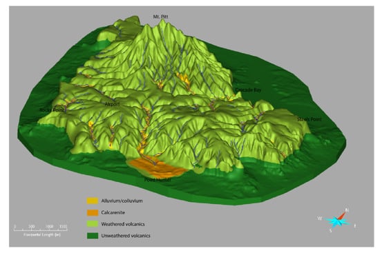 The soils and regolith derived from the basalts and tuff are deep (commonly as deep as 60 m) and the soils are quite permeable [6]. This, in combination with the humid climate and incised drainage lines, has resulted in strong surface water-groundwater connections across the island, as judged by the surface water and groundwater chemistry, and the once common expression of groundwater springs at the head of most drainage lines [6].
