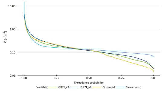 where is the exceedance probability difference of the 80%ile, non-zero exceedance value of the observed data in comparison to the simulated data and is the probability of 80% exceedance value calculated from concurrent simulated and observed time series. This objective function was favoured since it has been shown to produce a more balanced simulation that considers fit across the flow duration curve and at daily and annual time scales [33].