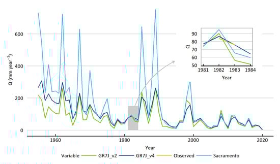 - Grigg, A.H.; Hughes, J.D. Nonstationarity driven by multidecadal change in catchment groundwater storage. A test of modifications to a common rainfall–run-off model. Hydrol. Process. 2018, 32, 3675–3688. [Google Scholar] [CrossRef]