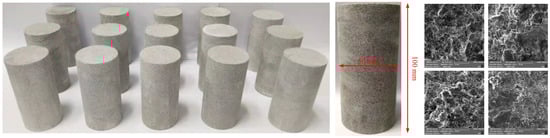As shown in Figure 1, the sample was taken from the sandstone roof of the Yushuwan coal mine of Shaanxi province in China. Its average thickness was about 11.85 m. The lithology was mainly fine-grained sandstone, composed of quartz and feldspar, with good sorting, argillaceous cementation, local calcareous cementation, including small, staggered bedding, slow wave bedding and blade fossils, and fractures were developed. The main purpose of the experiment was to understand the post-peak permeability variation of sandstone in the Yushuwan coal mine with cyclic loading–unloading times (CLT) and stress levels. First, the rock sample was processed into a standard sample with a size of 50 mm × 100 mm, and then the side and upper-lower end faces were polished and smoothed by sandpaper, so that the diameter and height errors of the processed sample were less than 0.02 mm and 0.05 mm, respectively. Finally, the sample density and longitudinal wave velocity were measured, and the average values were 2308 kg/m3 and 2334 m/s, respectively. The samples with large difference in the experimental results were removed. The scanning electron microscope (SEM) experiment and mercury injection experiment were carried out on sandstone to understand the basic properties of sandstone permeability, such as the initial fracture structure characteristics and initial porosity. Figure 2 shows the micro-structure images of sandstone at 1000× magnification with SEM. It can be seen from Figure 2 that the sandstone in the initial state contained more micro-cracks, and the micro-cracks were circuitous and bending without obvious strike. Moreover, the crack intersection phenomenon was obvious with the loose rock structure. In addition, the initial effective porosity of the roof sandstone was about 30.36% and the initial permeability was 3.53 × 10−17 m2.