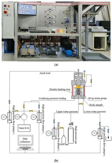 Figure 3 presents the schematic diagram of the rock series triaxial permeability experiment system produced by Top Industries. The experimental system was mainly composed of the axial loading system, the confining pressure system, the permeability system, and axial and radial displacement sensors. The core components of the multi-field coupling seepage experiment bench were an oil pump, water pump, and a triaxial pressure chamber. The principle of the permeability experiment was as follows: first, the sample was placed in the cylinder of the triaxial pressure chamber, and axial stress was applied to the sample by the axial loading system (P1 pump), with a maximum axial stress of 500 MPa; then, hydraulic oil was injected into the triaxial pressure chamber, and the confining pressure (P2 pump) was applied to the sample, with a maximum confining pressure of 60 MPa; finally, osmotic pressure was applied to the upper and lower ends of the sample, with a maximum water pressure (P3 pump and P4 pump) of 50 MPa. In order to accurately measure the axial deformation and radial strain, two LVDT displacement sensors were placed in parallel on both sides of the sample with a range of 12 mm and an accuracy of 0.001 mm.