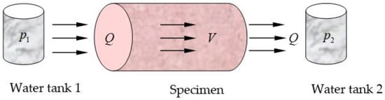 The principle of the transient method is shown in Figure 4. The volume of the two tanks in Figure 4 is B, the pressures are P1 and P2, and the heights and cross-sectional areas of the specimens are H and A, respectively. The pressure at both ends of the specimen at the initial moment is P10 and P20 (P10 > P20), respectively. The pressure gradient in the axial direction of the specimen is (P20 − P10)/H. During the permeation process, the liquid in water tank 1 passes through the specimen into water tank 2. The pressure (P1) in tank 1 decreases with the increase of pressure (P2) in tank 2. The pressure gradient (P2 − P1)/H gradually decreases until the pressures of the two tanks are equal and reach equilibrium state, as shown in Figure 5.