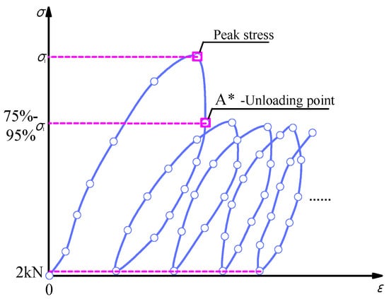 (3) The stress control mode was adopted to apply the design confining pressure to the sample at a loading rate of 0.5 kN/s, and then the axial strain control mode was adopted to axially load the sample at a loading rate of 0.003 mm/s until it reached 75–95% of the peak stress in the post-peak state (as shown in Figure 6: point A*). During the loading period, the permeability point was arranged with a gradient of 0.003 and the permeability was measured. The reason why 75–95% of the peak stress (point A*) was taken as the first unloading point of the post-peak sample was mainly because the sample had strong brittleness and the post-peak curve dropped significantly. Once the stress at the unloading point became too low, the post-peak stress state would be difficult to maintain, which was not conducive to the experiment. In addition, the closer the starting pressure of the stress–strain hysteresis was to the peak value, the more comprehensive the permeability change of the sample under plastic flow would be, and the experimental accuracy would be effectively improved.