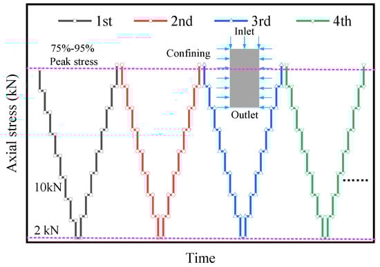(4) When the post-peak stress state reached point A*, the loading mode was switched from the axial strain control mode to the axial stress control mode, and the sample was unloaded step by step at a rate of 0.5 kN/s. During the unloading process, the permeability test points were arranged with 10 KN as the stress gradient, until it was reduced to 2 kN, and the unloading was stopped. Subsequently, reverse loading was started, and the loading rate, the arrangement of permeability points, and the control mode were the same as those of the unloading scheme until the stress state of A* was loaded. Then the cyclic loading–unloading permeability experiment was completed (see Figure 6).
