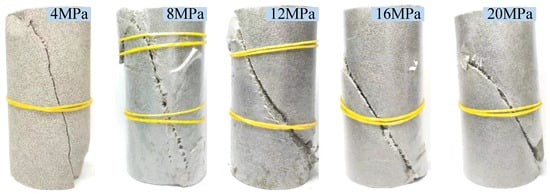 The average peak strength of specimens under different confining pressures are 30.56 MPa for σ3 = 4 MPa, 57.04 MPa for σ3 = 8 MPa, 62.13 MPa for σ3 = 12 MPa, 63.25 MPa for σ3 = 16 MPa, and 64.68 MPa for σ3 = 20 MPa. In addition, Figure 8 shows the typical failure morphology of specimens under various confining pressures. It can be seen from Figure 8 that a main crack runs through the upper and lower ends of the specimen, which is the main seepage channel. With the increase of the confining pressure, the main crack in the upper surface gradually shifts to the bottom, which may have a certain effect on the permeability test results. Shear failure is always the main failure mode no matter whatever the value of the confining pressure. The above analysis is similar to the results of previous infiltration tests.