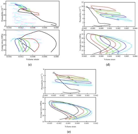 Relation curve of permeability and average stress with volumetric strain under different confining pressures. (a) σ3 = 4 MPa. (b) σ3 = 8 MPa. (c) σ3 = 12 MPa. (d) σ3 = 16 MPa. (e) σ3 = 20 MPa.