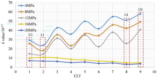 Figure 10 shows the variation of permeability with confining pressure and CLT, respectively. Table 3 presents the permeability value of various monitoring points under different confining pressures and CLT. The following can be summarized from Figure 10 and Table 3: