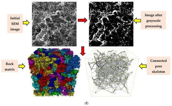 In order to reveal the permeability variation with the confining pressure with the microscopic mechanism, some initial and post-experiment samples were selected to carry out the SEM scanning test. Then, based on the 2D SEM image with high resolution, a numerical reconstruction calculation was carried out by using the random reconstruction method to obtain the 3D micro-structure characteristics of samples before and after the experiment, and the 3D pore model was characterized. The characterization parameters generally included pore diameter, effective porosity, connectivity, seepage path length, and tortuosity [33].