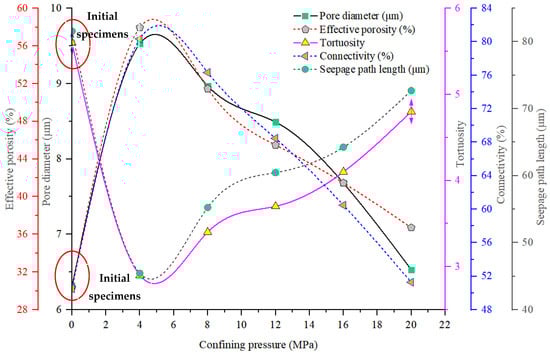 The variation law of seepage parameters (pore diameter, effective porosity, connectivity, seepage path length, and tortuosity) with confining pressure before and after test.
