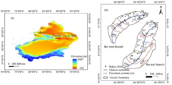 Study site description: (a) Location map of Urumqi Glacier No.1; (b) Sketch view of the study, including the locations of Urumqi Glacier No.1 and stakes in 2016.