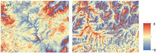 Interferogram after flattening. (a) the ascending Sentinel-1 pairs in 2017-06-11–2017-06-23; (b) the descending Sentinel-1 pairs in 2017-06-11–2017-06-23.