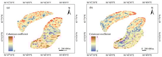 Coherence coefficient diagram. (a) the ascending Sentinel-1 pairs in 2017-06-11–2017-06-23; (b) the descending Sentinel-1 pairs in 2017-06-11–2017-06-23.