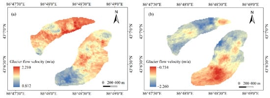 The glacier velocity of the ascending and descending LOS directions was estimated by combing DInSAR and offset-tracking technology based on the ascending and descending Sentinel-1 image pairs of the Urumqi Glacier No.1 from September 2016 to August 2017, as shown in Figure 5.