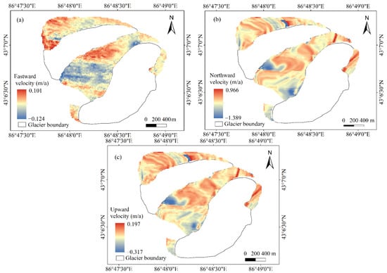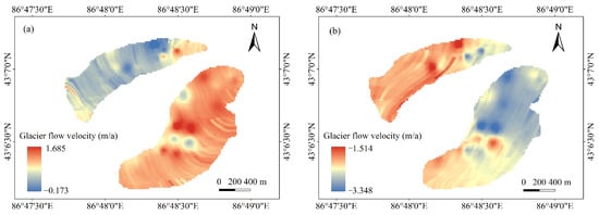 The estimated flow velocity of the Urumqi Glacier No.1 was compared with the glacier velocity based on the stake measurements from 2016 to 2017 to verify the results of the remote sensing estimation (Figure 10). As shown in Figure 10, the results of glacier velocity estimated by the two methods were close to each other. The average velocity difference between the two methods in the east, north, and vertical directions of the east branch from 2016 to 2017 was 0.090 m, 0.060 m, and 0.040 m, respectively. The average values of the velocity difference in the west branch were 0.108 m, 0.084 m, and −0.054 m in three directions. These results suggest that the mean error of the Urumqi Glacier No.1 velocity estimated by remote sensing was 0.131 m/a. In addition, the estimated velocity in most areas of the Urumqi Glacier No.1 was less than that measured by the stakes because the time measured by GPS RTK was longer than that estimated by the Sentinel-1 image.