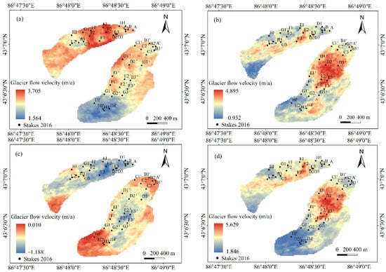 Difference between calculated and measured glacier flow velocity at the stakes. (a,c) show the velocity difference in the east branch. (b,d) show the velocity difference in the west branch.