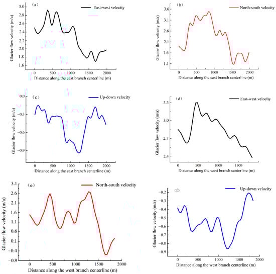 In order to quantitatively analyze the annual velocity characteristics of the Urumqi Glacier No.1, the velocity results of the centerlines profile of the glacier from 2016 to 2017 were investigated. The three directions of the east and west branch were obtained, as shown in Figure 8.