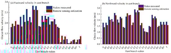 In order to assess the quality of the inversion results of glacier velocity, the results used root-mean-square error of the difference, which was between the measured velocity and the glacier flow velocity obtained from the inversion of Sentinel-1 images for all the stakes in 2016 and 2017, and were then evaluated and validated (Figure 11). The results show that the root-mean-square error of the difference between the measured velocity and inversed velocity in the east branch was 0.227 m, 0.258 m, and 0.126 m in three directions, respectively. Correspondingly, the differences between the three directions in the west branch were 0.185 m, 0.342 m, and −0.054 m, respectively. It can be inferred that the glacier flow velocity calculated based on the Helmert variance component estimation method has high accuracy. There is a significant difference between the inversion value and the measured value of glacier velocity at the individual stakes. On the one hand, the stake points could not correspond to each image element. The way that points were selected in the buffer may harm the inversion results. On the other hand, glacier surface morphology changes rapidly, giving rise to more noise and decoherence effects.