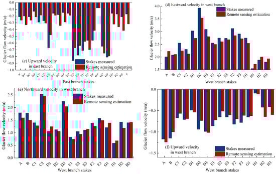 The comparison between the estimated glacier velocity by remote sensing and the measured glacier velocity at the stakes. (a–c) show the velocity in the east branch. (d–f) show the velocity in the west branch.
