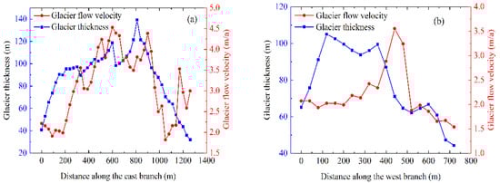 According to the drawn centerlines profile (Figure 8), it can be seen that the eastward, northward, and upward flow velocities of the east branch of the Urumqi Glacier No.1 in 2016 and 2017 were 2.280 m/a, 2.327 m/a, and −0.457 m/a, respectively. On the other hand, the eastward, northward, and upward flow velocities of the west branch were 2.843 m/a, 1.834 m/a, and −0.644 m/a, respectively. As can be seen, the horizontal velocity was higher than that of the vertical direction of the centerline in the east branch. Additionally, the east and vertical flow velocities in the west branch were higher than the velocities of the same direction in the east branch. However, the north velocity was slightly lower than the east branch’s. This phenomenon is likely to result from glacier thickness and slope. From the variation in the glacier flow velocity with elevation, the east, the north, and the vertical velocities of the east branch and west branch generally show a gradually increasing trend initially, followed by decreasing trend. It is probably due to glacier thickness, subglacial topography, and glacier surface morphology. The glacier flow velocity of the two branches in the horizontal direction reached a peak at the middle and lower reaches of the glacier. The vertical velocity of the glacier rose to a high point and peaked in the middle of the glacier. At the end of the glacier, the eastward, northward, and upward velocities exhibited a fluctuation that first decreases and then increases, influenced by glacier meltwater.